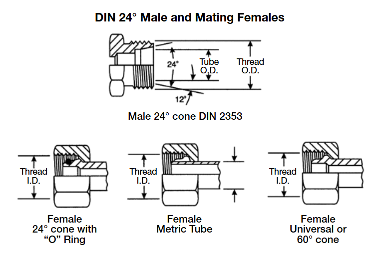 DIN 24°錐外螺紋接頭可與以下三種內螺紋接頭相配。外螺紋接頭有24”錐面,直管公制螺紋和與鋼管外徑相匹配的臺階孔。與之相匹配的內螺紋接頭可以是24°外錐帶O形圈,(DKO型式)的公制管接頭或者通用的24°錐或60°錐。