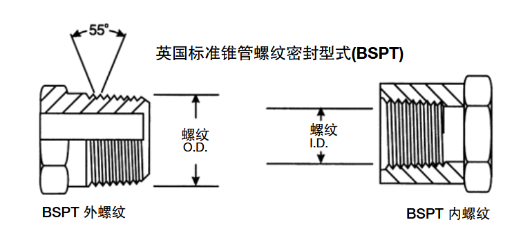 BSPT接頭類似于NPTF,但是不可以互換。兩者之間的大多數尺寸的螺紋螺距不同,BSPT螺紋的牙型角為55°,而NPTF螺紋的牙型角為60°。
