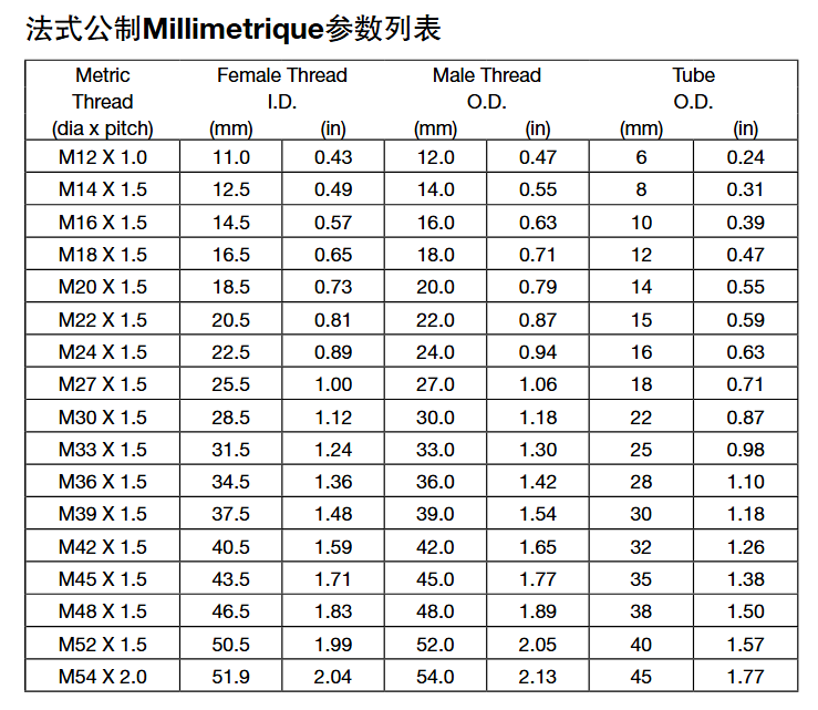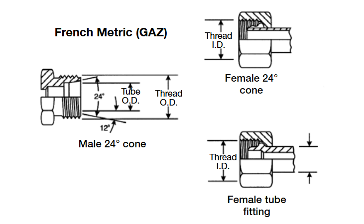 法式接頭包括普通的外螺紋接頭和2種不同的內螺紋接頭,法式公制(GAZ)外螺紋接頭可以匹配24°錐內螺紋接頭和管內螺紋接頭。外螺紋接頭有24°內錐面和直管公制螺紋。內螺紋接頭有24度外錐面或管套和直管公制螺紋。Millimetrique系列可用于所有管徑的公制管,GAZ系列只可用少數管徑的公制管。