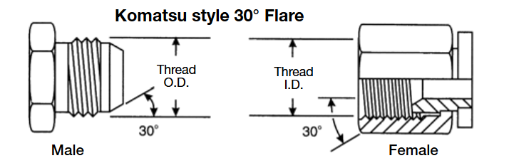 小松式30°擴口平行螺紋接頭和日制30°擴口平行螺紋接頭相同的,除了螺紋不一樣。小松接頭遵從JIS B 0207標準,使用公制細牙螺紋。小松接頭的密封通過30°擴口實現。