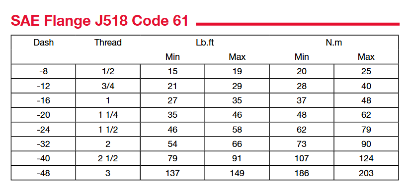 *所有標號61的法蘭頭達到或超過SAEJ518中標號61對于液壓對開法蘭連接的要求。標號61法蘭頭設計可以承受最大工作壓力3000至5000 磅,視尺寸而定。