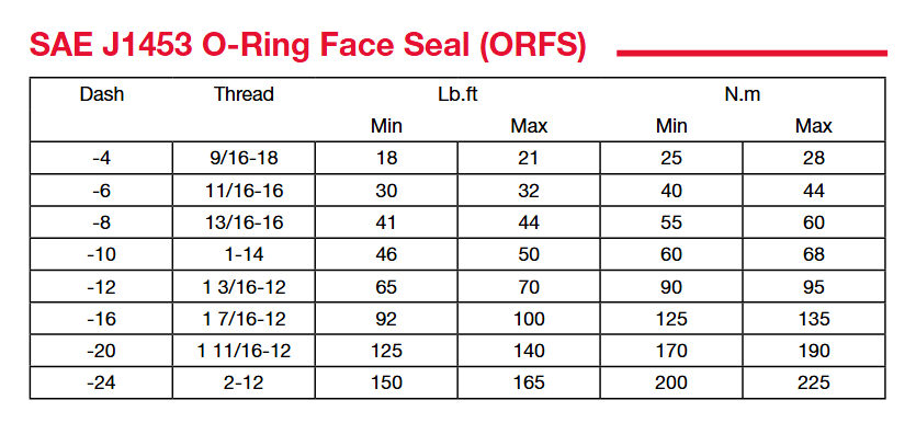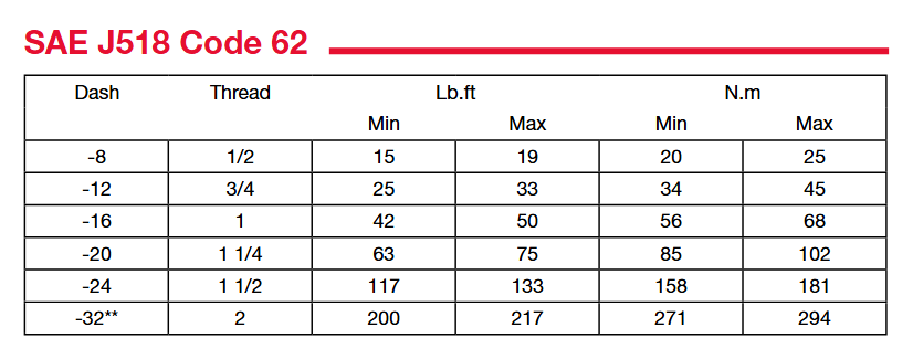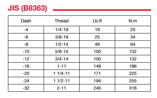 軟管接頭和過渡接頭安裝扭矩推薦表