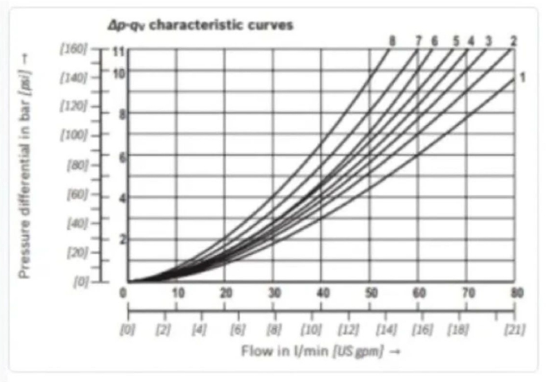 所有閥門都有不同的流動(dòng)通道和流體方向變化,這將在特定流量下產(chǎn)生一定的壓降。這些壓降因不同的閥芯類型而異,這對(duì)于控制能源效率并確保負(fù)載有足夠的可用壓力非常重要。