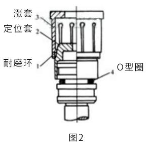 圖2所示工裝由定位套和漲套組成。定位套頭部有5°倒角,用于引導(dǎo)O形圈和耐磨環(huán)裝入活塞端部溝槽。漲套由彈性較好的65 Mn鋼經(jīng)熱處理制成,加工成均勻?qū)ΨQ(chēng)的8瓣結(jié)構(gòu)。需要注意的是,加工各瓣底部的小孔時(shí),分度要均勻,銑開(kāi)各瓣時(shí)應(yīng)使鋸口對(duì)準(zhǔn)小孔的中心,以保證漲套各瓣能均勻漲開(kāi)。同時(shí)各部位都應(yīng)進(jìn)行(光滑)倒角,以免損壞密封圈。